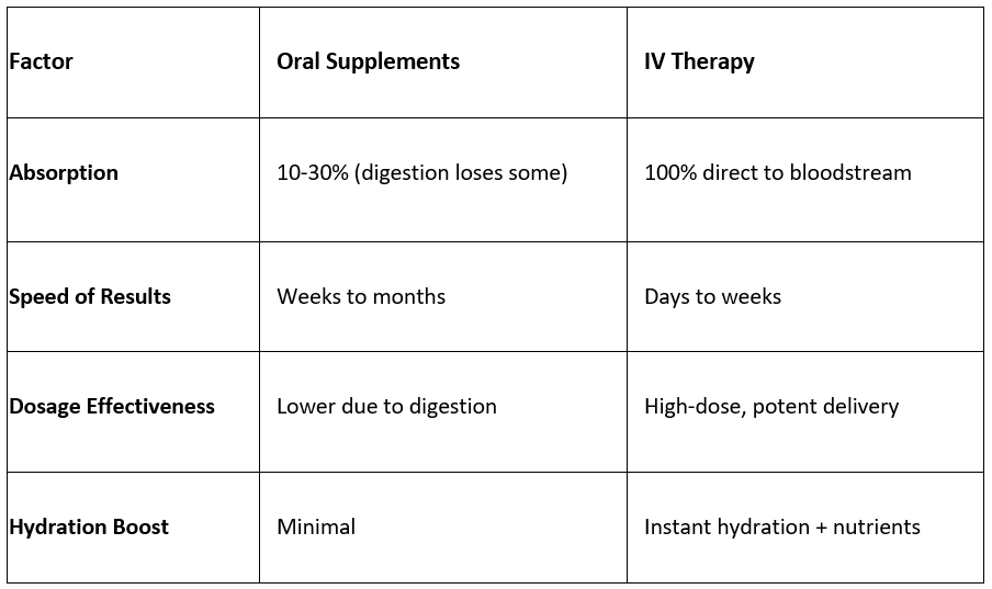 Even if you eat well, digestion isn’t perfect—your body may only absorb 10-30% of vitamins from pills. That’s where IV therapy steps in with 100% effectiveness.