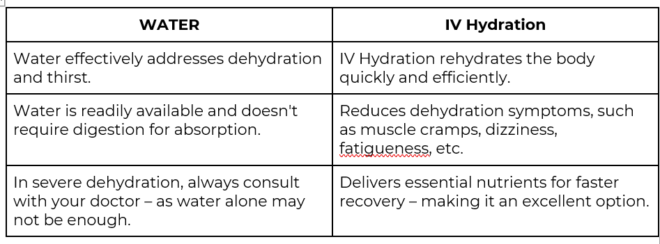 This section of the article dives into the world of hydration speed, comparing water and IV hydration therapy and learning which one is better. We'll also explore how each method works and which might be the right choice for you in a clear table below.