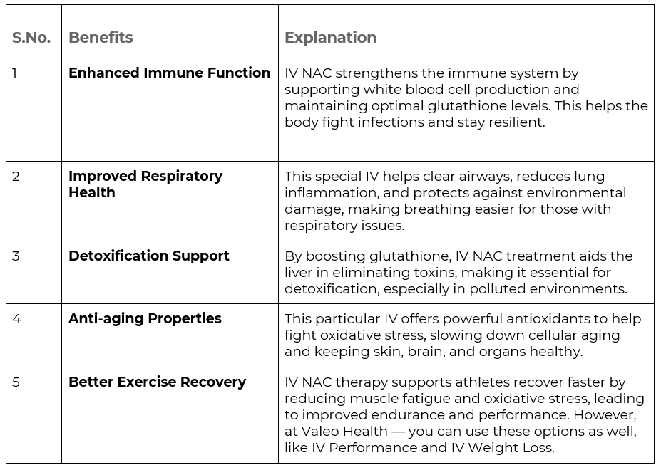 The benefits of IV NAC therapy go beyond just respiratory health. With regular sessions, you can experience a range of powerful health perks. To make it easier, we’ve listed the top five in a simple table: