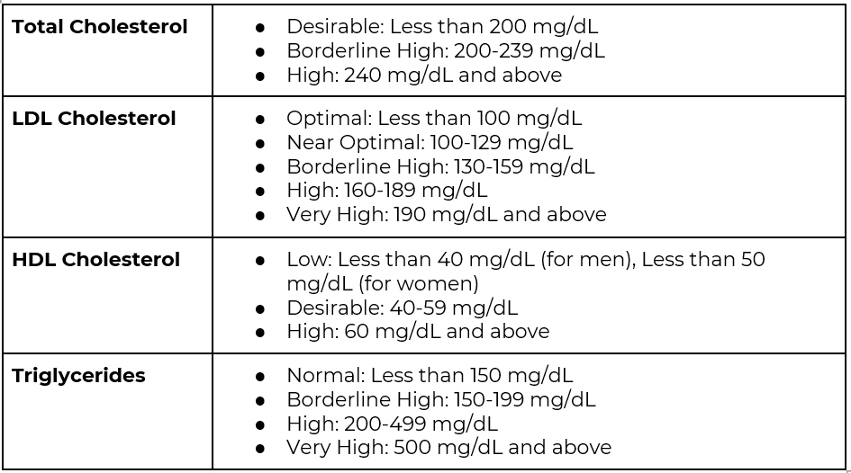1. Total Cholesterol: This is the total amount of cholesterol in your blood. It includes both "good" and "bad" cholesterol.
