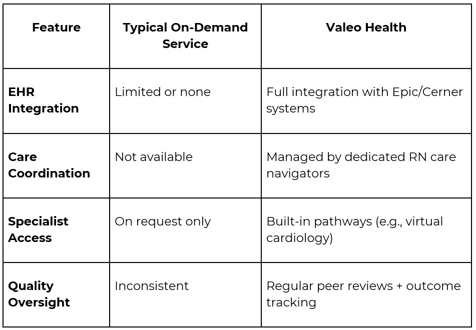 Unlike typical app-based services, Valeo Health offers much more than just a doctor on call. We bring care to your home while staying fully connected with top hospitals, labs, and specialists. Whether it’s a lab test, IV therapy, or a follow-up consult, everything is part of a smooth, coordinated system.